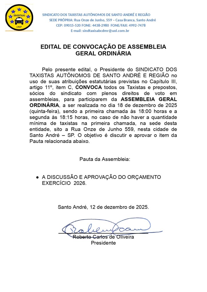CONVOCAÇÃO DA ELEIÇÃO DA DIRETORIA DO SINDITAXIABC